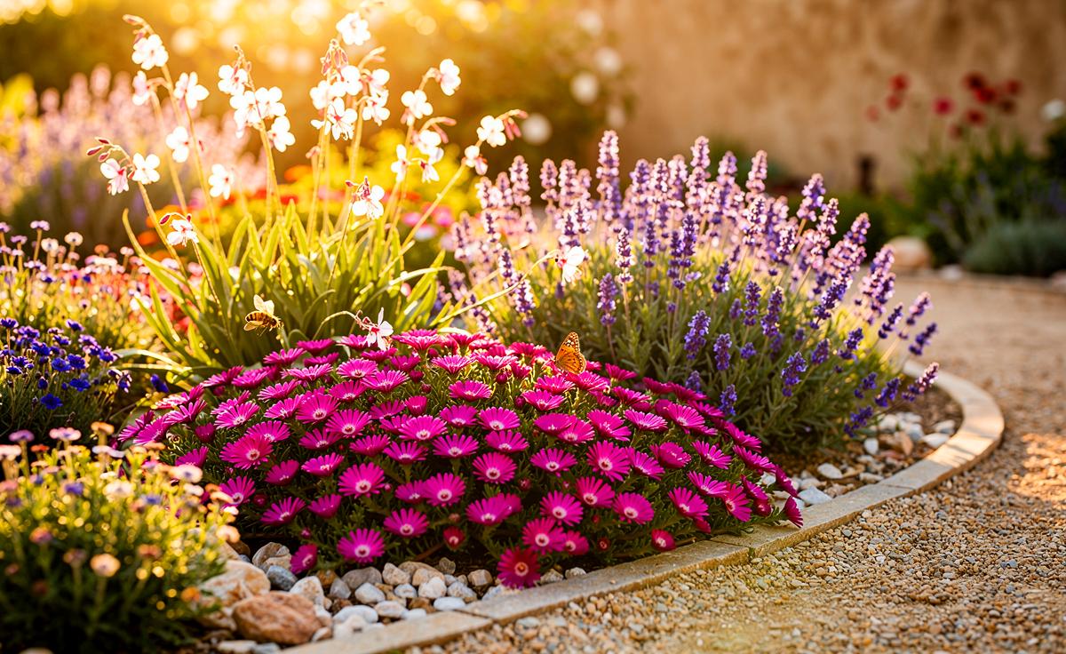 | Delosperma cooperi (Mittagsblume) | Mai–Oktober | Vollsonne, sehr durchlässig | Teppichbildend, extrem trockenheitsfest | Keine Winternässe; karger Kiesboden |